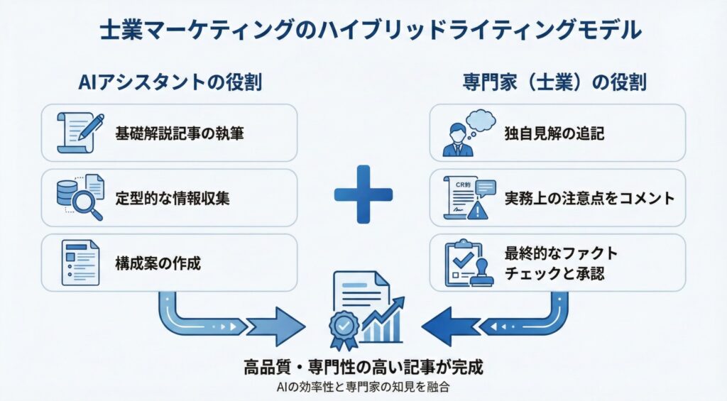 考えてみてください。先生が解説記事を書く際、その大部分は、条文の定義や制度の概要といった、誰が書いても同じになる「客観的な事実」の説明に費やされていませんか? この最も時間のかかる部分をAIアシスタントに任せ、先生は最も価値の高い「専門家としての知見」の言語化にのみ集中する。これは、時間がない士業にとって現実的な選択肢となり得るほか、Web集客の取り組みを継続しやすくする効果が期待できます。
