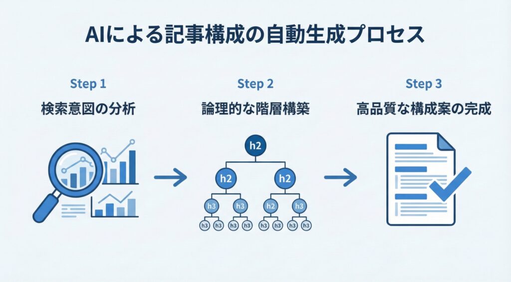 SEO記事作成の工程において、競合を調査し、ユーザーの検索意図を汲み取り、論理的な見出し構造を設計する作業は、最も専門知識と時間を要する部分です。AIはこの複雑なプロセスを自動化し、構成案の作成時間を大幅に短縮できる可能性がありますが、実際の短縮効果はツールや作業内容によって異なります。