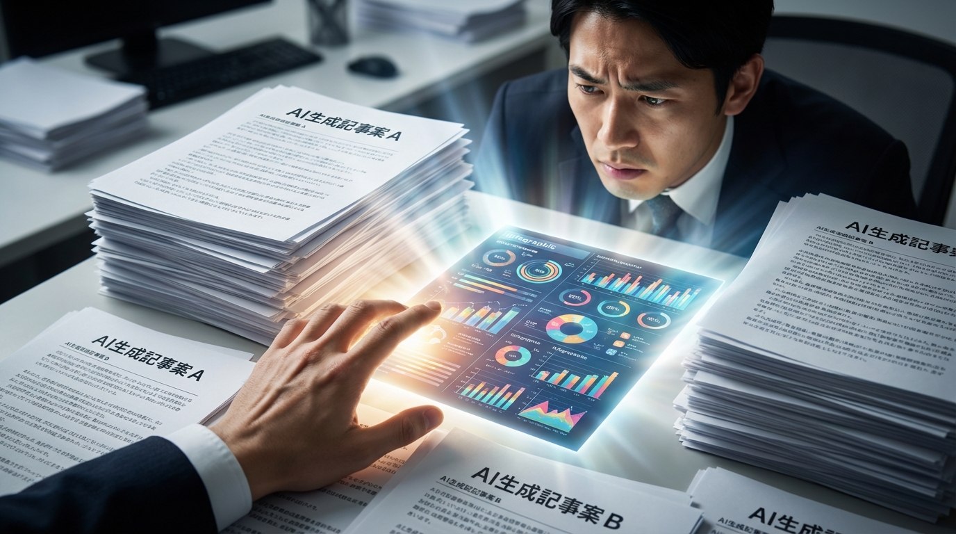 AIライティングツールを導入し、コンテンツの量産体制を整えたにもかかわらず、「なぜか競合サイトと差がつかない」「PVが伸び悩んでいる」といった課題に直面していないでしょうか。多くのWeb担当者が、AIが生み出すコンテンツの画一性に頭を悩ませています。