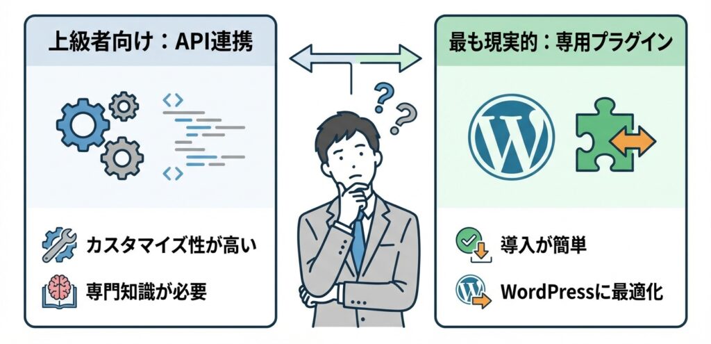 この理想のワークフローを実現するためには、大きく分けて2つのアプローチが存在します。それぞれにメリット・デメリットがあり、あなたのスキルや環境によって最適な選択は異なります。ChatGPTのような外部ツールとWordPress専用AIプラグインの違いを理解し、自社に最適な方法を見つけましょう。